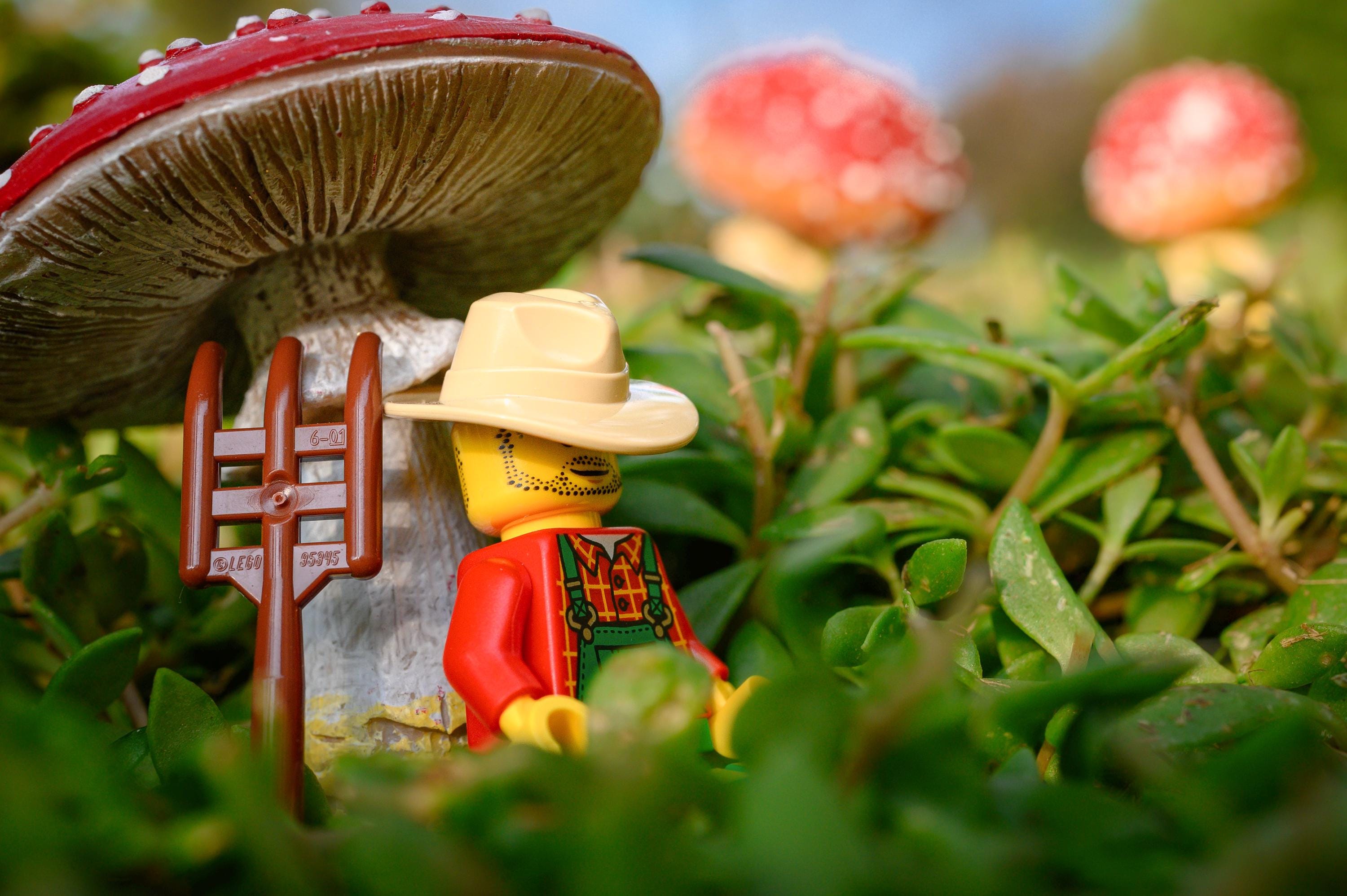 🎁 Keywords: lego farmer art print, mushroom macro photography, whimsical forest wall decor, morning sunlight lego photo, cozy miniature art, woodland storytelling print, nature-inspired lego photography, storybook wall art