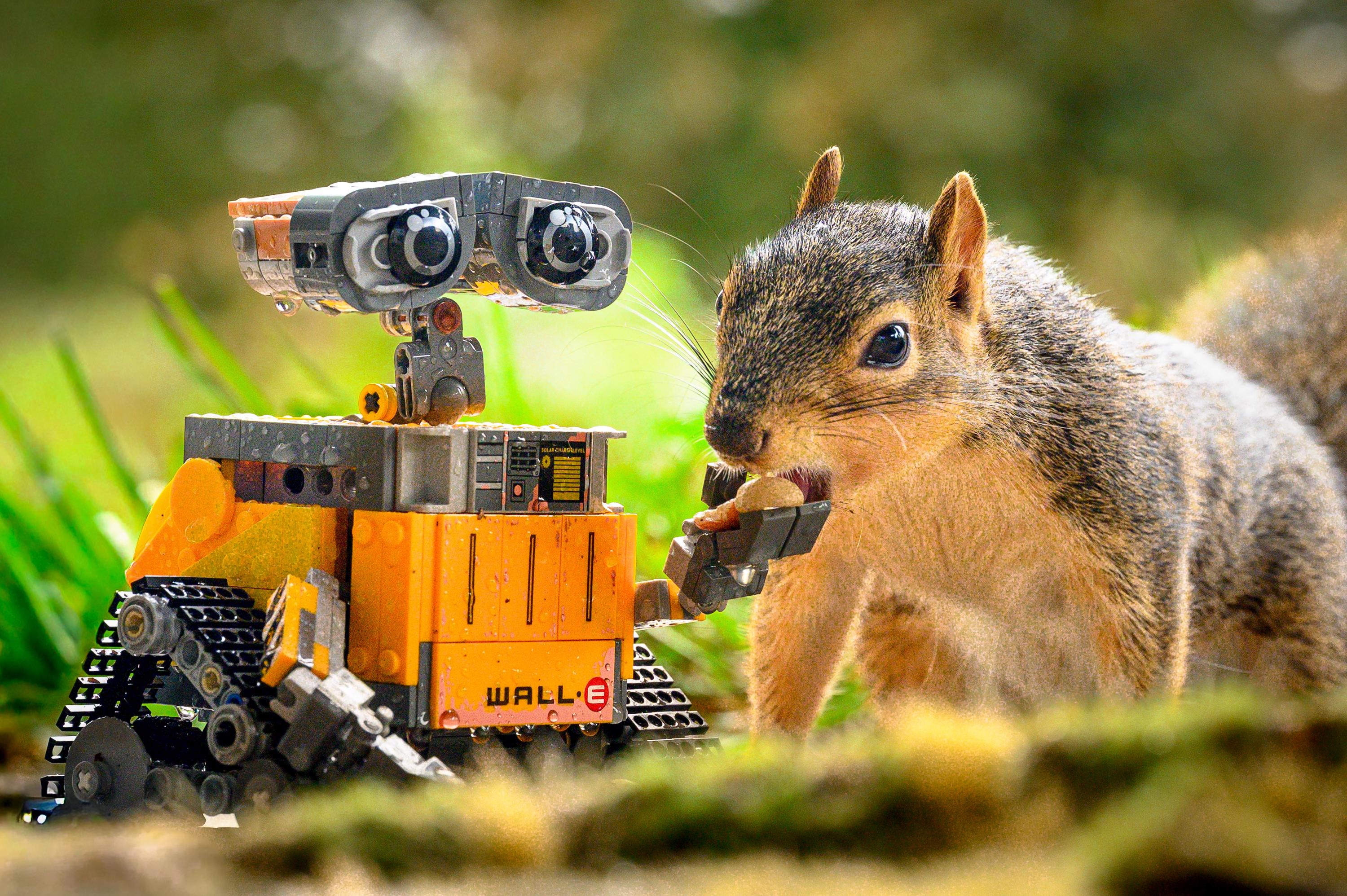 🎁 Keywords: wall-e lego art print, lego macro photography, squirrel wall art, whimsical pop culture photo, disney pixar lego photography, miniature nature scene, robot and animal art, geek gift idea