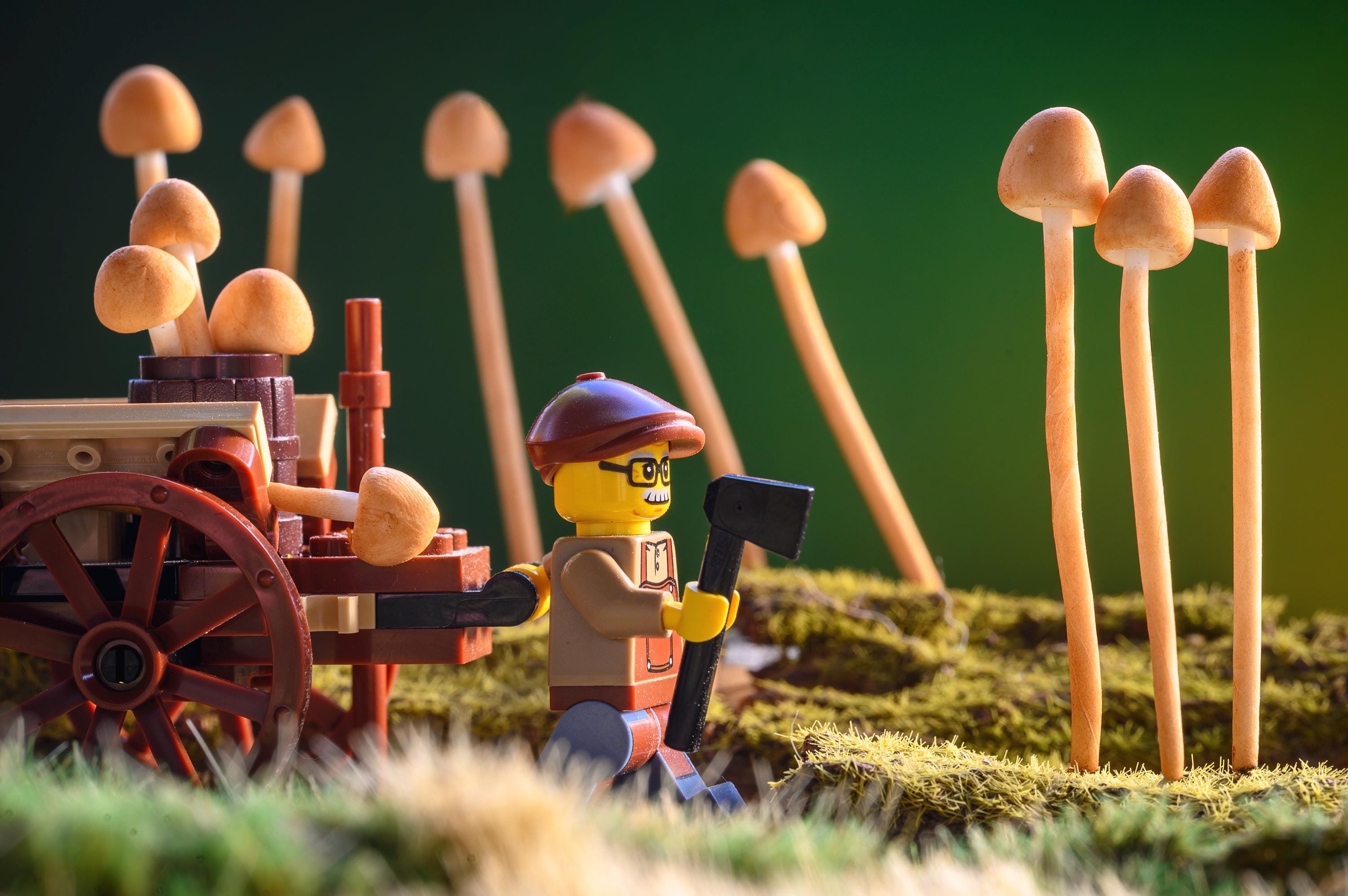 Step into the quiet charm of the forest with this macro LEGO photo featuring a character harvesting mushrooms with a small cart. Every detail — from the carefully stacked mushrooms to the textures of the forest floor — brings a miniature world to life, blending whimsical storytelling and nature-inspired artistry.