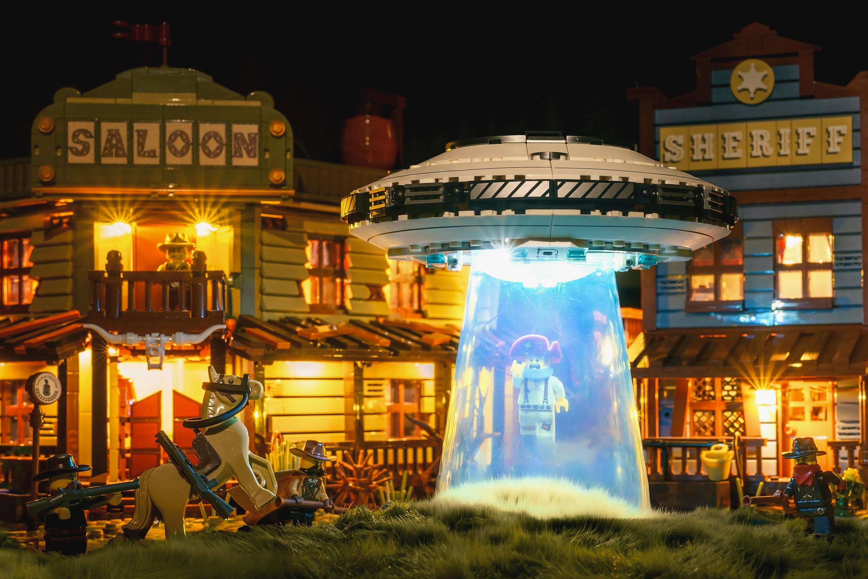 Saddle up for the strangest showdown in the West with this imaginative LEGO photography print featuring a classic cowboy-era scene interrupted by a glowing UFO abduction. With cinematic lighting, dusty western tones, and an eerie extraterrestrial glow, this piece blends frontier nostalgia with playful sci-fi charm.