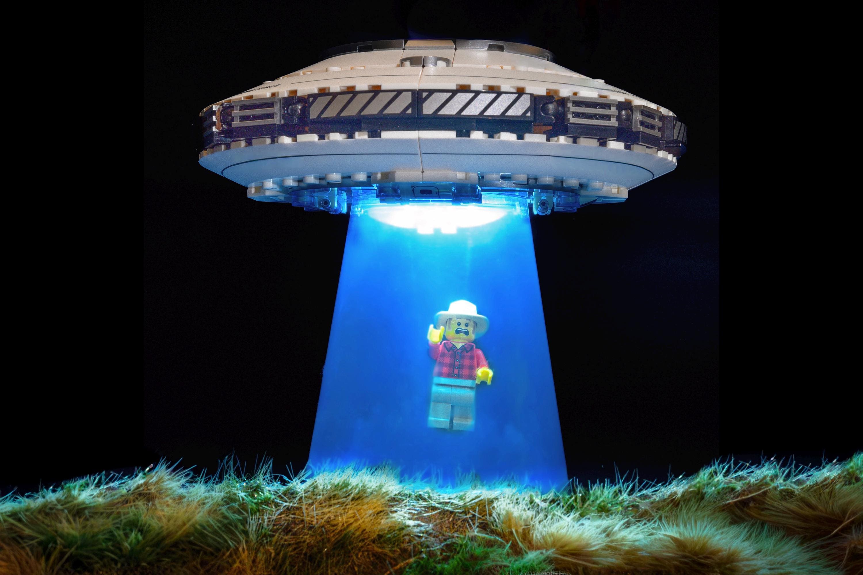 Bring humor, sci-fi charm, and cinematic storytelling into your space with this imaginative LEGO photography print featuring a farmer being abducted by a glowing UFO. With dramatic lighting, rich nighttime colors, and a perfect blend of comedy and suspense, this artwork captures a full sci-fi story in a single frame.