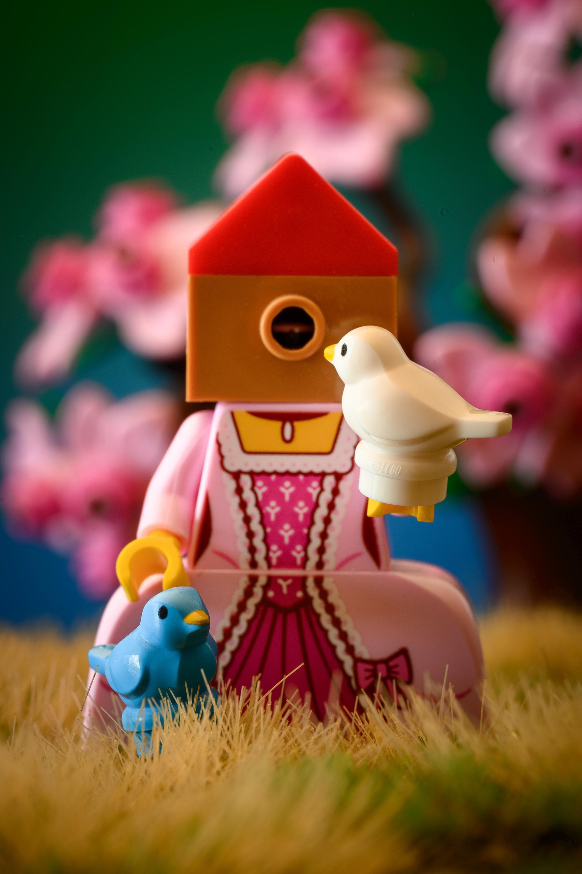 Bring a touch of imagination, color, and storytelling to your space with this enchanting LEGO photography print. Featuring a pink-gowned figure with a charming birdhouse head and two friendly birds, this artwork blends whimsy with fine-art detail—perfect for anyone who loves playful décor, unique art prints, or vibrant nature-inspired scenes.