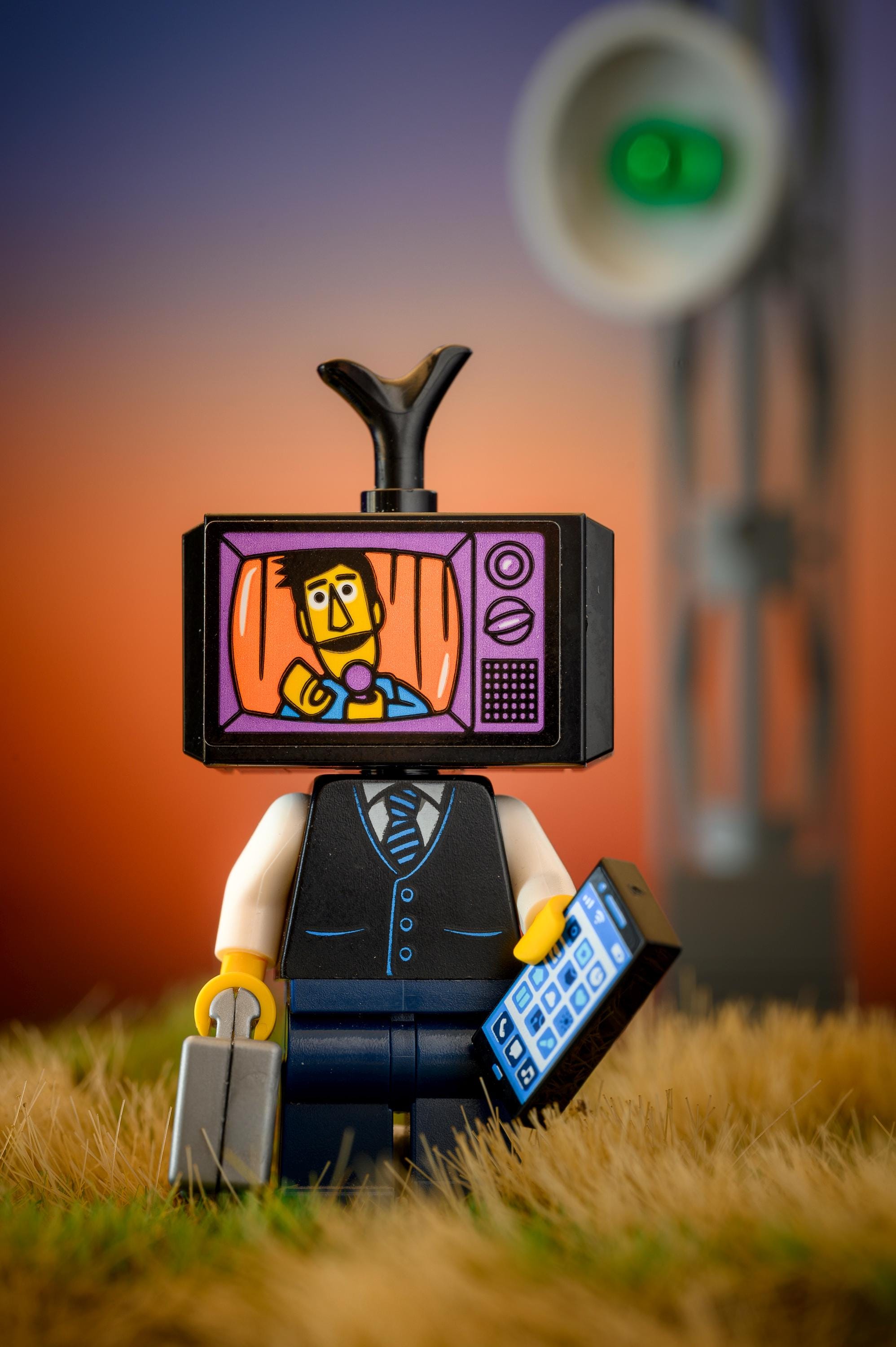 Add a bold pop of personality to your walls with this imaginative LEGO photography print featuring a business-suited minifigure with a vintage television for a head. The vibrant sunset background, retro antenna, and expressive illustrated “face on screen” create a playful yet thought-provoking piece—perfect for fans of surrealism, pop-culture art, and creative toy photography.