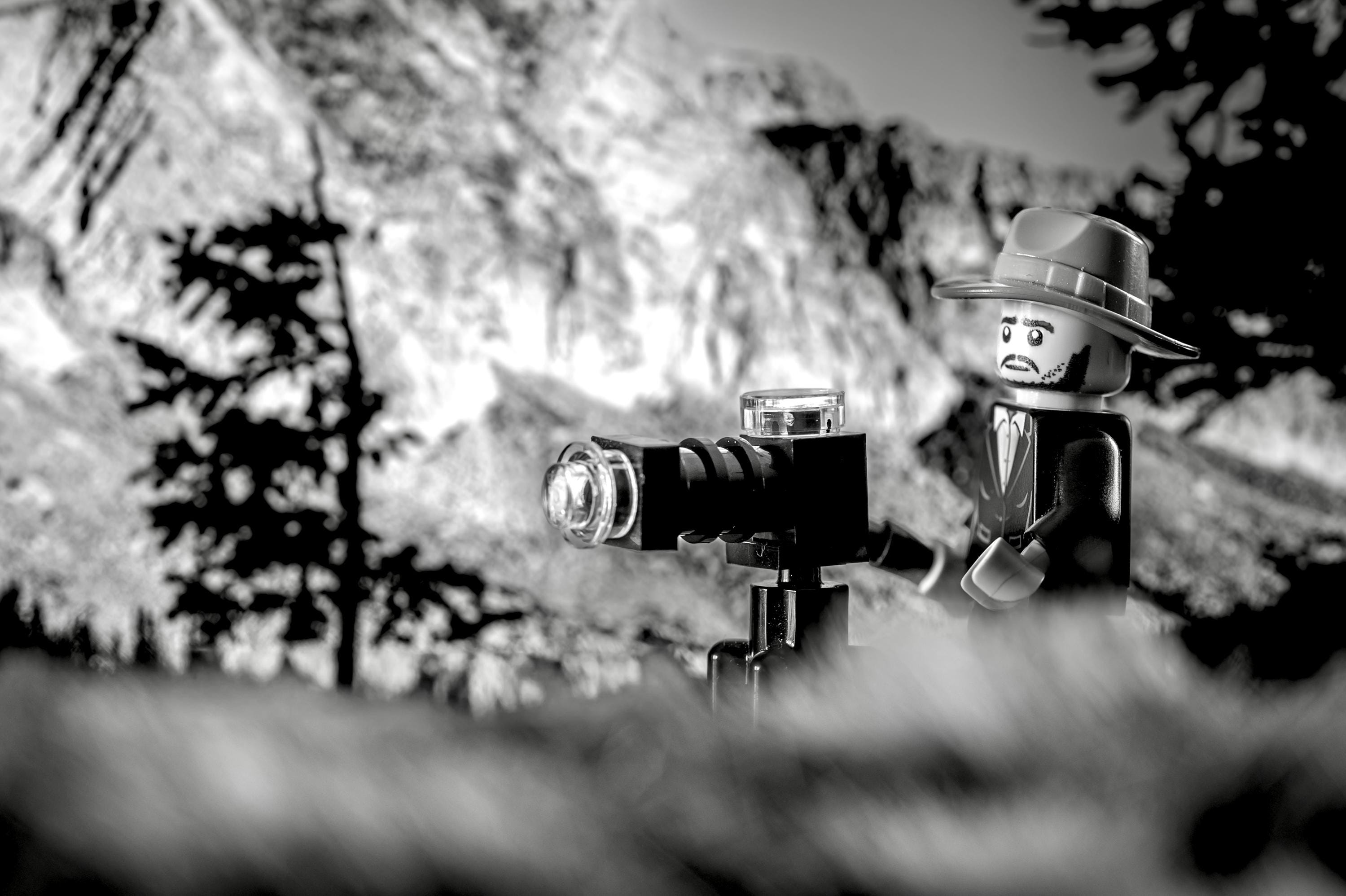 Bring together the timeless spirit of landscape photography and playful creativity with this unique LEGO-inspired art print featuring a miniature version of Ansel Adams at work in the mountains.
