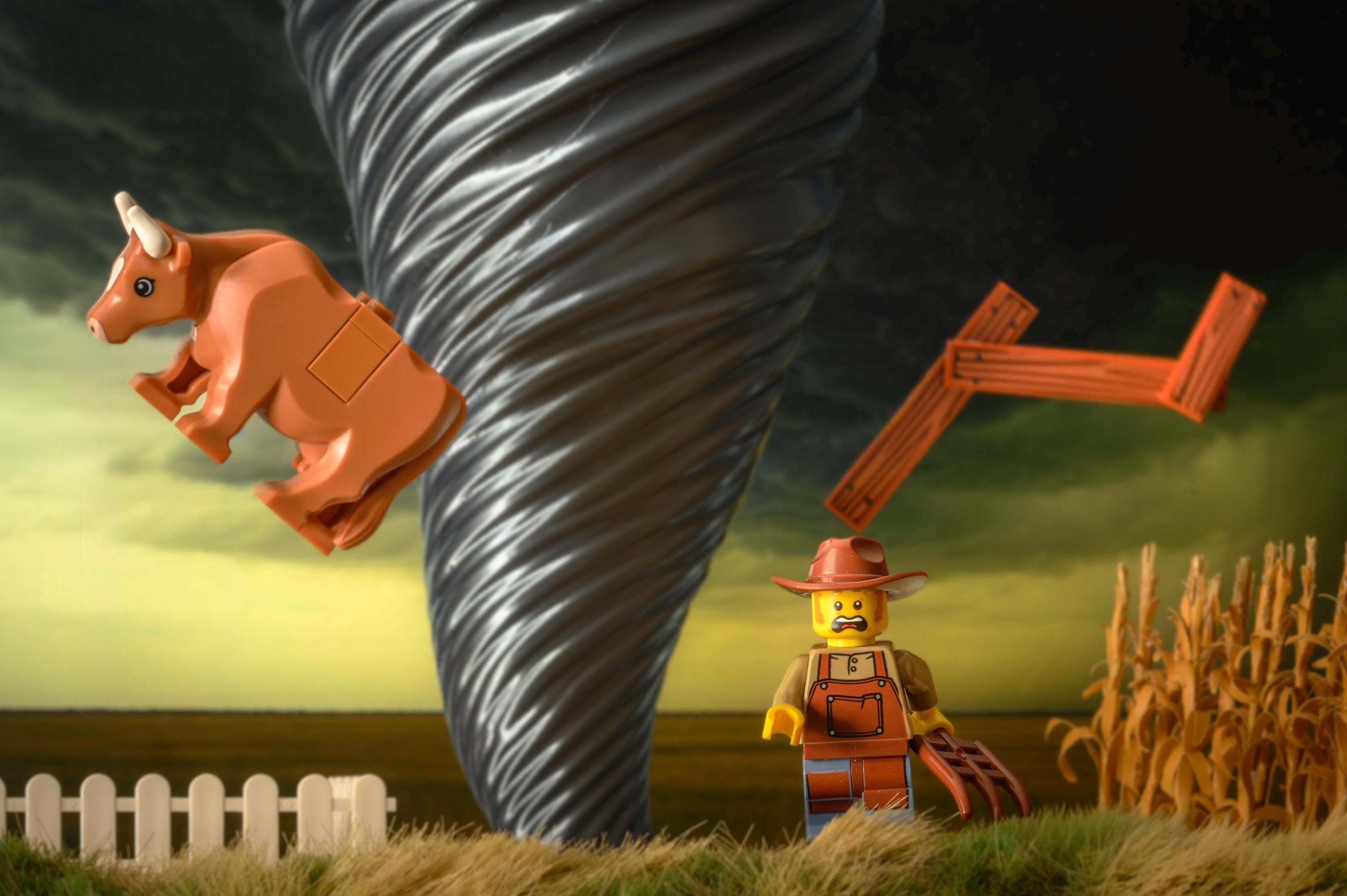 This original photography print captures a powerful tornado tearing through a quiet farm landscape, reimagined in LEGO with cinematic detail. The contrast between the peaceful rural setting and the chaos of the storm creates a dramatic, high-impact image that immediately draws attention.