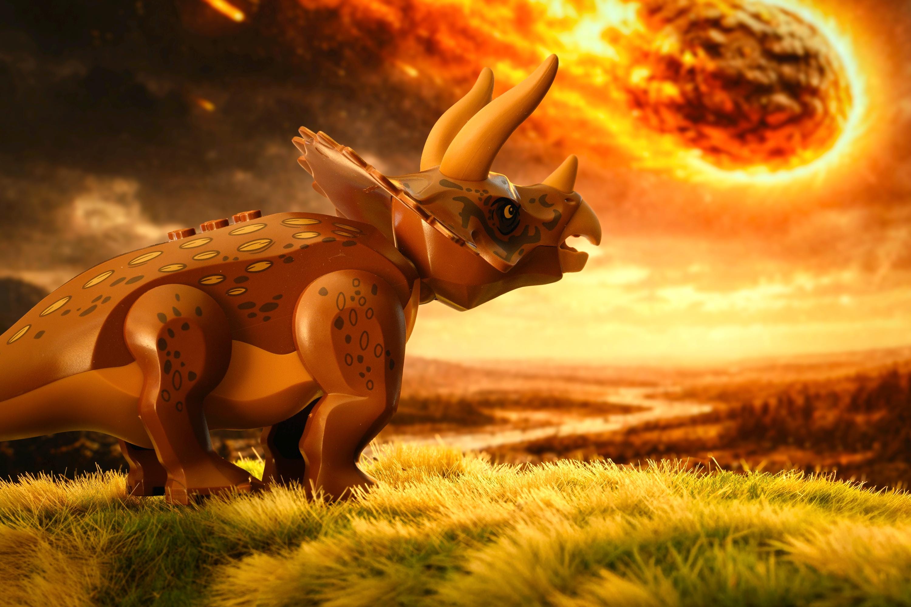 This cinematic fine art photograph captures a LEGO Triceratops bracing for the catastrophic impact of an incoming asteroid—frozen in a powerful, emotional moment just before extinction. Dramatic lighting, atmospheric detail, and storytelling come together to transform a familiar toy into an epic prehistoric narrative.